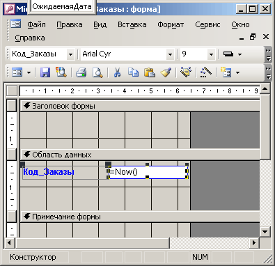 Откройте форму в режиме конструктора. Нажмите кнопку Поле (Text Box) на панели элементов, расположенной на рисунке вдоль левой вертикальной границы окна. Указатель мыши в активной области формы примет вид символа поля в верхнем левом углу которого отобразится значок «+». Щелкните мышью место, где должно располагаться название нового поля. Измените в поле надпись «поле» на новое имя/например, Дата/время. Щелкните рядом поле, в котором будут отображаться, результаты расчетов, с надписью Свободный и введите расчетную формулу.