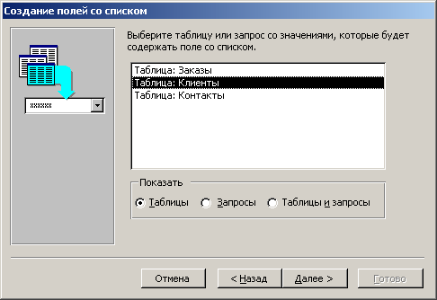 Выбор таблицы или запроса, значения которой будет содержать поле со списком