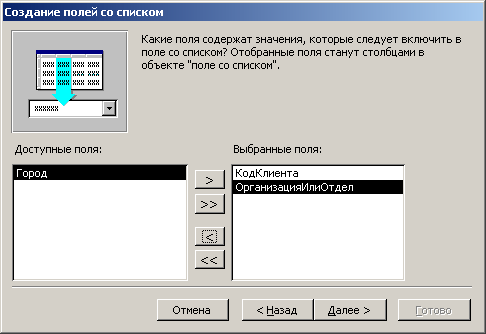 В новом окне выберите поля, которые должны быть включены в поле со списком, и нажмите кнопку со значком >, чтобы перенести их в список