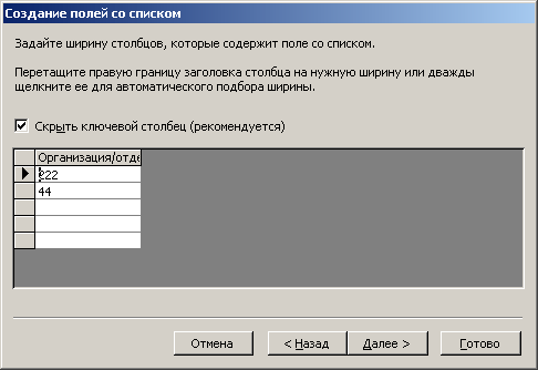 В следующем диалоговом окне отображены списки значений для поля со списком. С помощью мыши измените ширину столбцов, если вы считаете, что они должны быть шире или уже предлагаемой величины. Ширина столбца должна позволять полностью отобразить данные, хранящиеся в нем. По умолчанию установлен флажок