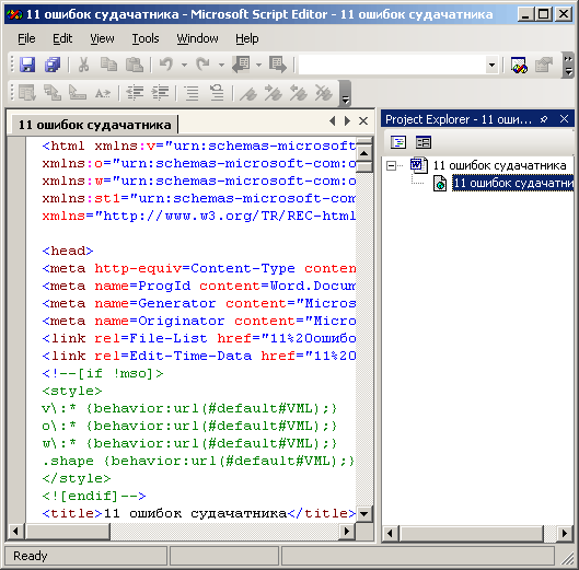 Если вы хотите просмотреть HTML код или изменить дескрипторы для лучшего оформления веб-страницы, выберите в меню Вид (View) команду Источник HTML (HTML Source). Файл отобразится в окне Microsoft Script Editor (рис. 27.5). .